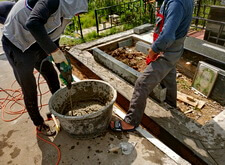 Приступаем к работе с цветниками. Один уже был в наличии, поэтому делаем второй, идентичный. По проекту цветники должны смотреться одинаково даже несмотря на то, что памятники будут разные. В это же время укладываем гранитную брусчатку уже на территорию места захоронения.